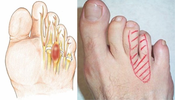 Неврома Мортона, лечение которой должно быть своевременным, чтобы избежать развития осложнений, появляется между средним и безымянным пальцами. Чаще всего уплотнение образуется только на одной стопе, но не исключается и ее двустороннее расположение. Патология возникает, преимущественно, у женщин от 50 лет и старше.