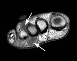 Если заболевание находится на ранних стадиях развития, и уплотнение на стопе не имеет особой выраженности, пациента отправляют на прохождение более детальных медицинских обследований – МРТ ноги или рентгенографическое, чтобы исключить такие болезни, как артрит, либо перелом, так как они имеют схожую симптоматику.