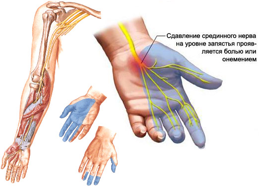 Как следствие, начинает развиваться ишемия. На начальной стадии развития синдрома происходит постепенное разрушение оболочки срединного нерва, но если давление не ослабить, внутренние оболочки нерва начинают уплотняться и рубцеваться. Данный процесс проявляется сильной болью в запястье и чувством онемения.